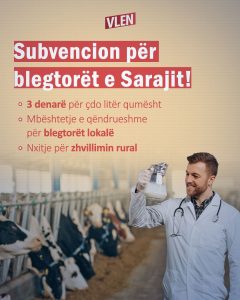 Komuna e Sarajit numëron rreth 100 familje që merren me blegtori, të cilat përballen çdo ditë me sfida të mëdha në tregun vendas. Përmes kësaj mase, kandidati synon jo vetëm t’i lehtësojë blegtorët, por edhe të stimulojë prodhimin e brendshëm të qumështit si një bazë e fortë për zhvillimin ekonomik lokal.