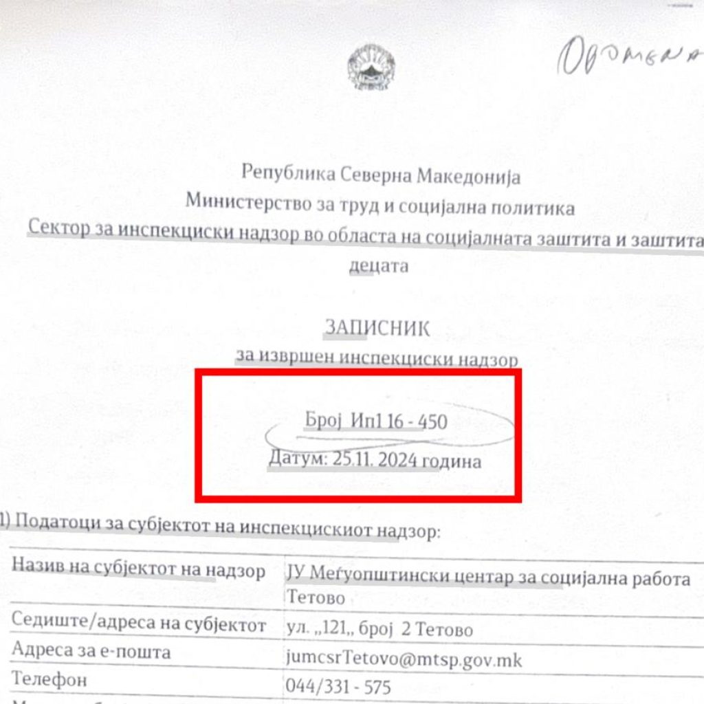 Por procesverbalet e inspektimit flasin ndryshe. Sipas një procesverbali të inspektimit kontrollues të datës 25 nëntor 2024, inspektorati ka kryer kontroll mbi lëndët e përfituesve të të drejtave sociale dhe ka konstatuar mangësi serioze në zbatimin e masave të mëparshme, të përcaktuara me vendime inspektuese. Në këtë dokument, si person përgjegjës i subjektit të kontrollit figuron Magdalena Veselinovska, në cilësinë e ushtrueses së detyrës drejtoreshë.