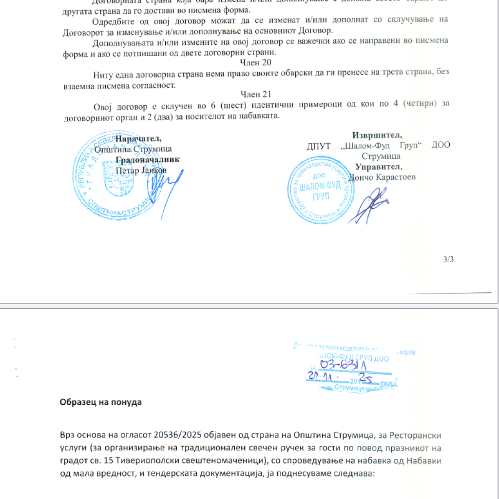 Компанијата беше единствен понудувач и добитник на тендерот за ресторански услуги за свечениот ручек кој се одржа на 11 декември, по повод локалниот празник „Св. 15 Тивериополски свештеномаченици“. Вкупната вредност на договорот е 400.000 денари со ДДВ, со кој компанијата се обврза да обезбеди традиционален свечен ручек до 250 гости. Свечениот ручек се одржал во ресторанот „Шалом“ во Струмица.